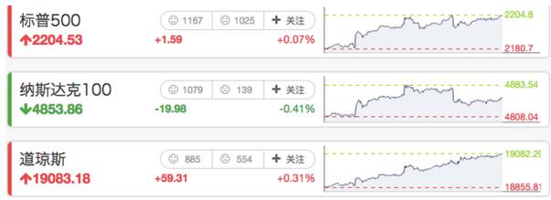 標普500指數收漲1.78點,漲幅0.08%,報2204.72點。 道指收漲59.31點,漲幅0.31%,報19083.18點。 納指收跌5.67點,跌幅0.11%,報5380.68點。