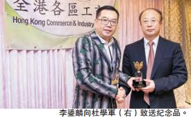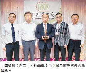 隨后,李鋈麟向杜學軍致送紀念品,雙方亦合影留念。出席的全港各區工商聯首長還包括:副會長陳焜鏞、彭華雄,執行委員會副主席黃浩昇、李澤民,會董何少偉、吳瑞偉、周穗華、劉玉珍、詹嘉雯、陸佩玲,全港購物節總監黃藹妍等。