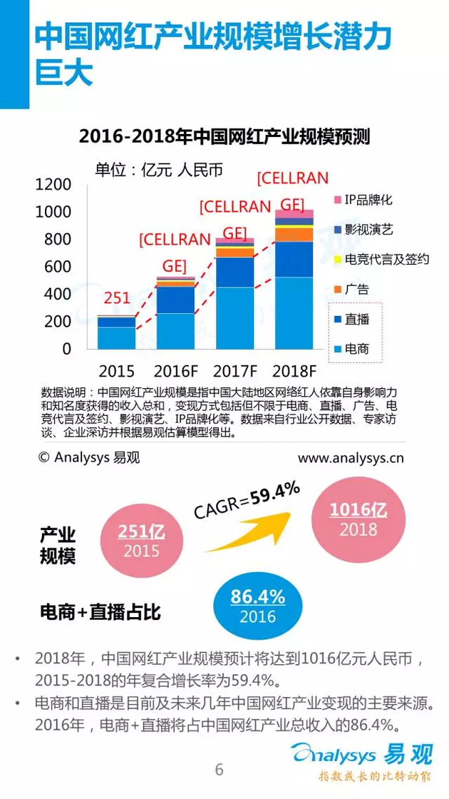 記者注意到,根據Analysys易觀預測,2016年中國網紅產業規模將達到528億元人民幣,2018年將超過1000億元人民幣。2015-2018年複合增長率為59.4%。網紅變現方式中,電商和直播為主要變現來源。