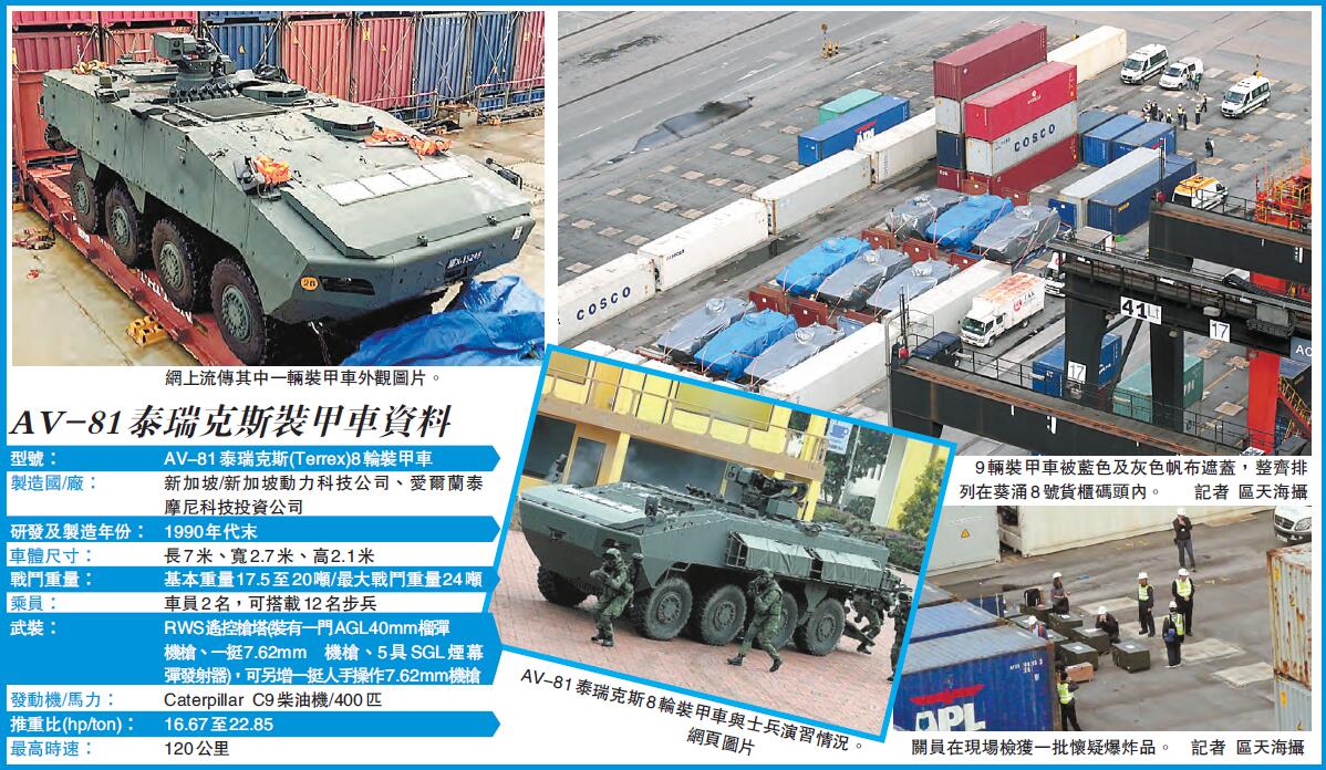 本報記者昨日趕至貨櫃碼頭了解情況,從高角度位置鳥瞰,發現有9架懷疑是裝甲車形狀的大型貨物,分別被藍色及灰色帆布遮蓋並放置在貨架上,排列得如九宮格一樣,四周則被多個貨櫃圍住,儼如圍牆,貨櫃場內人士亦難以靠近。有熟悉軍事人士看過照片後表示,該裝甲車相信是新加坡的Terrex AV-81型號,屬較新的品種。