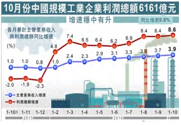 【香港商報網訊】工業生產回暖跡象愈加清晰。國家統計局昨日公布數據顯示,今年1-10月,全國規模以上工業企業實現利潤總額52567.7億元,同比增長8.6%,增速比1-9月加快0.2個百分點,繼續保持高位運行。業內認為,工業產品銷售加快及價格上漲成為主要推動因素,但高技術制造業、中小民營企業處境依舊不樂觀,需要提高警惕。
