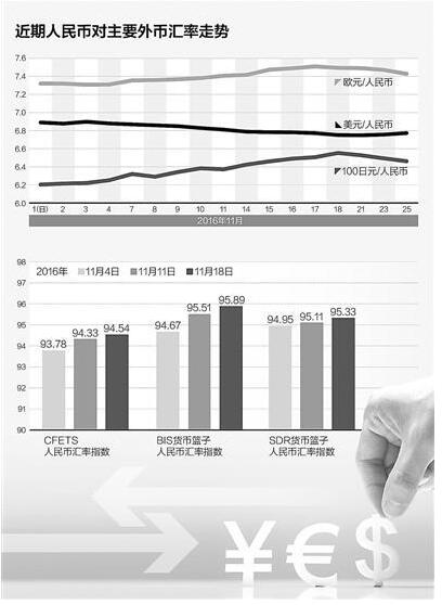 中国外汇交易中心发布的数据显示,11月18日,CFETS(中国外汇交易中心)人民币汇率指数为94.54,较10月末94.22有所上涨;BIS(国际清算银行)货币篮子和SDR(特别提款权)货币篮子的人民币汇率指数分别为95.89和95.33,相比9月末,三个人民币汇率指数均稳中略有升值。10月份,CFETS人民币汇率指数始终在94上方运行,全月年化波动率为2.11%,保持着较小的波幅,人民币对一篮子货币汇率基本稳定。