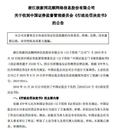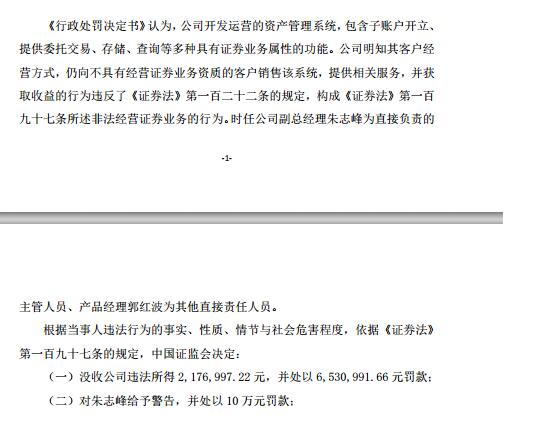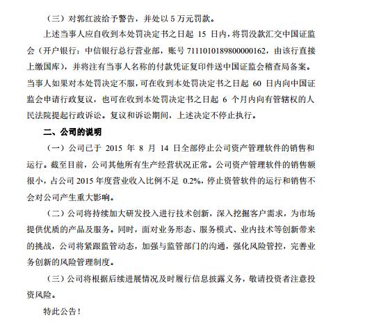 公告称,2016年11月26日公司收到了中国证监会下发的[2016]124号《行政处罚决定书》。处罚书称公司开发运营的资产管理系统,包含子账户开立、提供委托交易、存储、查询等多种具有证券业务属性的功能。公司明知其客户经营方式,仍向不具有经营证券业务资质的客户销售该系统,提供相关服务。