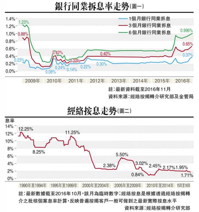 根據經絡按揭轉介研究部及金管局的數據顯示,自從今年五月開始,拆息持續上升,其中六個月期息衝破一厘關口,是繼09年的1.23%後,再創另一高位,相差只有約四分之一厘,而一個月期息,則是繼2011年的0.4厘後的第二高位,最新的息率徘徊在0.36及0.37水平。(圖一)