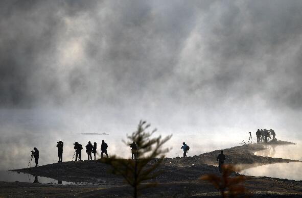 11月28日清晨,几名摄影爱好者在安徽省黄山市黟县的奇墅湖边拍摄风光。