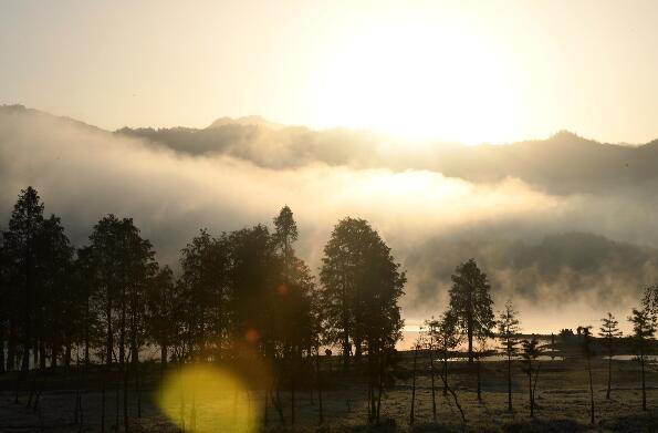冬日清晨的皖南,水面雾气腾腾,云蒸霞蔚,徽派建筑的村落层次分明,在晨光中如同画卷一般。
