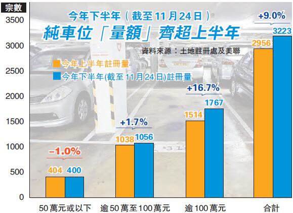 與此同時,開發商乘勢而為。在「辣招」影響導致市場前景不明朗情況下,開發商紛紛封盤,改為拆售樓盤車位,令市場車位供應量有顯著提升。據中原報告,截至11月23日,今年11月份整體車位(包括住宅、寫字樓及工廈車位)買賣合約登記暫時錄得729宗,總值10.92億元。金額已經超越10月整月的10億元,上升9.2%,創2015年11月後的12個月新高。預測11月全月整體車位登記宗數約800宗。