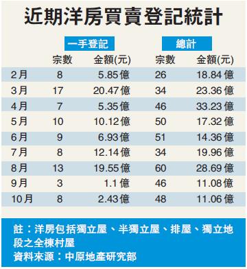 一手方面,10月份一手洋房買賣合約登記錄得8宗及總值2.43億元,按月分別升1.7倍及1.2倍。雖然一手洋房交投回升,但黃良昇稱,洋房新盤買賣仍然偏低。