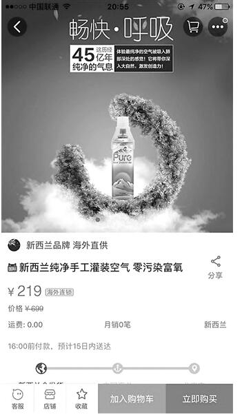 但對于通過郵寄等方式從海外直購的瓶裝空氣,工商部門表示,目前只要符合國外的生產許可要求,國內未有禁止銷售的法律法規。