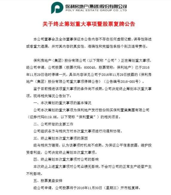 而到了當天晚上19時剛剛,僅僅10個小時,保利地產突然發布公告宣布終止購買保利置業相關項目,并于11月30日復牌。