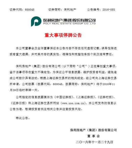 保利地產公告稱,保利地產此次籌劃的事項為保利地產發行股份購買保利置業集團有限公司,但此次籌劃宣布終止,股票將于11月30日復牌。