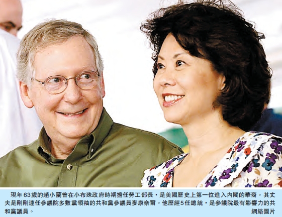 趙小蘭的丈夫是剛剛連任參議院多數黨領袖的共和黨參議員麥康奈爾。他歷經5任總統,是參議院最有影響力的共和黨議員。