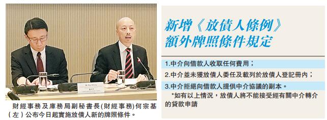 【香港商报网讯】记者叶佩瑜报道:为杜绝不良财务中介,特区政府今日起实施放债人新的牌照条件,规定如中介向贷款人收取费用、未获放债人委任及载列於放债人登记册内或拒绝向贷款人提供中介协议的副本,放债人均不可接受有关转介的贷款申请。财经事务及库务局副秘书长(财经事务)何宗基相信新措施将有一定成效,当局会跟进情况,适时检讨。