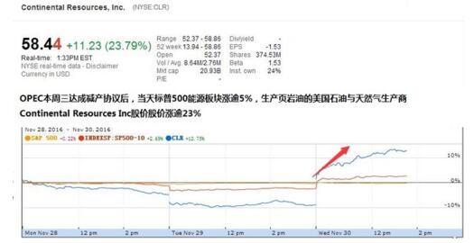 昨晚媒體稱OPEC本周三維也納會議達成減產計劃,擬減產120萬桶/日至3250萬桶/日。該消息推動國際油價大漲逾7%,美股能源板塊周三開盤半小時后漲近3%,生產頁巖油的美國石油與天然氣生產商Continental Resources Inc股價更是高漲。