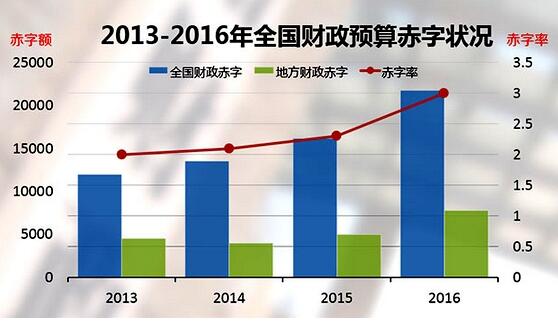 為了給營改增5000億元減稅目標留出空間,2016年財政赤字規模從16200億元擬擴大至21800億元,赤字率提至3%,創歷史最高。