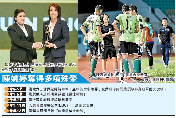陳婉婷前晚於阿聯酋阿布扎比舉行的亞洲足協(AFC)頒獎禮中,當選「年度最佳女教練」,是香港首位教練奪得此殊榮,她身為首位帶領男子球隊奪得頂級聯賽冠軍佳績的女教練,以上述經驗壓倒日本女足U17助教岡本三代、朝鮮女足主教練李金淑,成功當選亞洲足協年度最佳女教練。