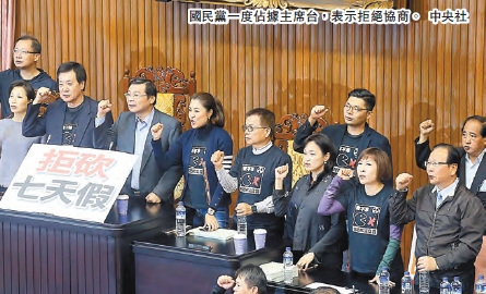 根據立法院昨天排定的會議議程,勞基法部分條文修正草案列入昨天議程討論事項,蘇嘉全也宣布下午會先進行協商。而國民黨團憂心協商仍是流於形式,中午率先占據在主席台上。下午協商后,朝野仍無共識,國民黨團書記長江啟臣表示,協商也不會改變任何事情,直接表決就好,并要占據在主席台的國民黨立委們撤離。