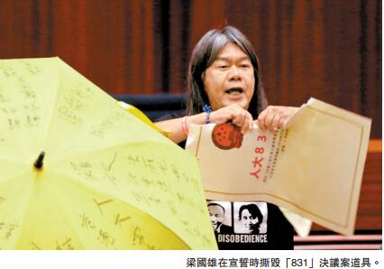 劉小麗以「龜速」斷斷續續極其緩慢地宣讀誓詞,以其說是宣誓,不如說是示威,以此發泄對誓詞的不滿。這可謂司馬昭之心,路人皆知,就算小學生也能看得出來。其后她亦在Facebook里坦言「龜速」是表達不認同誓詞之內容。姚松炎、羅冠聰則擅改誓詞,加油添醋,把所謂「真普選」、「自治、自決」之類的個人政見滲入誓詞之中。梁國雄更是頭頂黃傘,手舉標語,一副混世魔王的模樣,根本是在演戲而非宣誓,半點莊重也沒有。