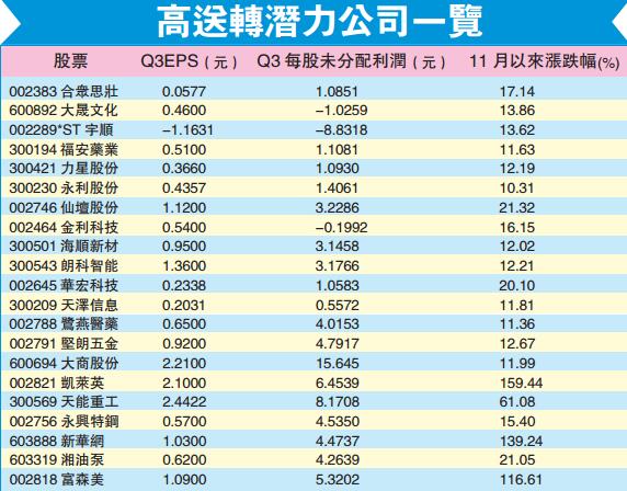 國海證券研報指出,分析三季報數據,依據流通股本低於5億、每股資本公積高於1元、每股未分配利潤大於2元、每股凈資產高於3元、2015年年報以及今年中報未實行高送轉5個指標進行梳理,有30家公司高送轉可能性較大,這些公司大多是上市兩年以內的次新股。具體看,每股未分配利潤、每股資本公積金較高的公司中,新易盛、蘇奧傳感、創新股份和盛訊達四家公司三季報每股未分配利潤以及每股資本公積金之和均在9元以上。此外,三季報每股未分配利潤+每股資本公積較高的還有川環科技(300549)、鷺燕醫藥(002788)、雄帝科技(300546)、達威股份(300535)、朗科智能(300543)、三棵樹(603737)、雪榕生物(300511)、世名科技(300522)、康普頓(603798)等。