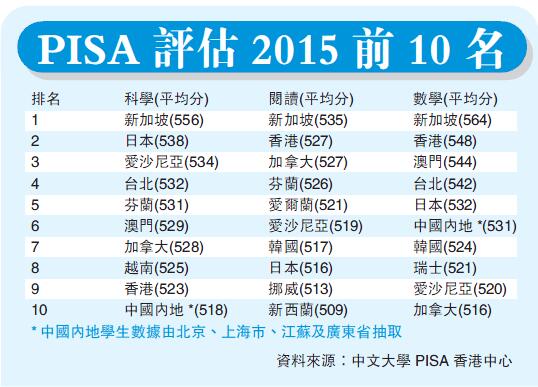 中文大學香港教育研究所「學生能力國際評估計劃(PISA)香港中心」昨日公布每3年進行一次的研究結果。今屆評估重點是學生的科學能力。調查發現,在參與研究的72個國家地區和經濟體系中,香港15歲學生的能力表現仍居前列。科學、閱讀、數學排名分別為第9、第2、第2。上屆(2012年)排名分別為第2、第2、第3。