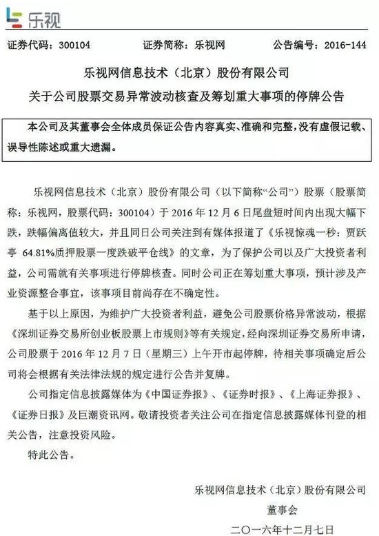 晚間,樂視網再發公告稱,公司將對媒體所報道的“跌破平倉線”有關事項進行停牌核查。