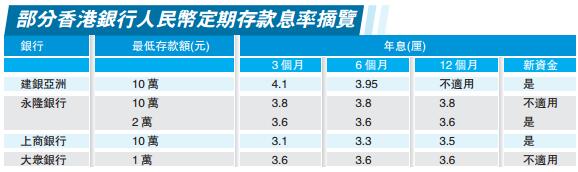 率先加入戰團,包括永隆、上商、信銀及建銀亞洲等。永隆銀行將一般客戶3至24個月期10萬元門檻的人幣定存息一律加至3.8厘,而2萬元門檻的同期限存息則加至3.6厘,僅限新資金。