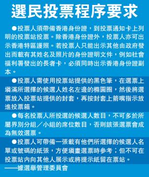 合资格的选民今日投票时,要用获分发的黑色笔,在选票上填满候选人姓名左边的椭圆圈,最多可拣选所属界别分组选委名额的人数。选民填完选票后,要将选票放入票站提供的封套,然后再按封套上的箭嘴指示放入票箱;选民不能摺叠选票或封套。