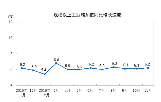 據國家統計局網站發布的數據顯示,2016年11月份,中國規模以上工業增加值同比實際增長6.2%,較10月份加快0.1個百分點。從環比看,11月份,規模以上工業增加值比上月增長0.51%。1-11月份,規模以上工業增加值同比增長6.0%。