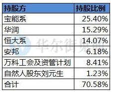 到目前為止,寶能系持萬科股本25.4%,華潤持股15.29%,恒大系持股14.07%,安邦持股6.18%,萬科管理層通過金鵬資管計劃持股4.14%,萬科企業股中心通過德贏資管(德贏1號、2號)計劃持有3.66%,萬科工會持股0.61%。
