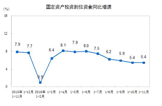 據國家統計局數據,2016年1-11月份,全國固定資產投資(不含農戶)538548億元,同比名義增長8.3%,增速與1-10月份持平,其中,國有控股投資191080億元,增長20.2%。環比來看,11月份固定資產投資(不含農戶)增長0.54%。
