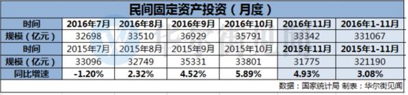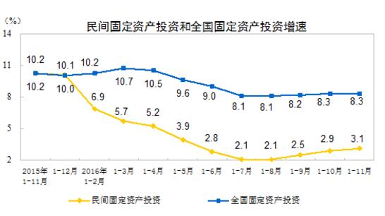 1-11月份民間固定資產投資331067億元,同比名義增長3.1%,比1-10月份提高0.2個百分點,連續第三個月加快。民間固定資產投資占全國固定資產投資(不含農戶)的比重為61.5%,與1-10月份持平,比去年同期降低3.1個百分點。
