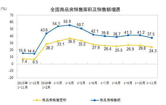 鳳凰財經訊 國家統計局13日發布的統計局數據顯示,1-11月商品房銷售面積135829萬平方米,同比增長24.3%,增速比1-10月份回落2.5個百分點。從11月單月數據看,銷售面積為15491萬平方米,為去年11月以來的最低擴張速度,還不及10月26.4%同比增速的三分之一。