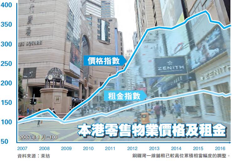 雖然零售舖租仍未能擺脫調整局面,但數據同時反映,第三季銅鑼灣、尖沙咀、中環及旺角一線舖租的跌幅,已由第二季分別錄得跌3.6%至5.1%收窄至上季的跌2.2%至3.5%。