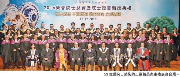 【香港商報網訊】記者余江強報道:香港工業專業評審局昨午假理工大學蔣震劇院舉行2016榮譽院士及資歷院士證書頒授典禮,邀請教育局局長吳克儉出席主禮,伯恩光學(香港)有限公司總裁楊建文和香港理工大學校長唐偉章分獲頒發傑出成就獎。53位工業精英包括18位榮譽院士,2位工程院士,4位工商院士,8位院士,21位副院士獲頒發證書。