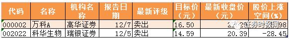 此外,12月份有兩家上市公司被給予了賣出評級,分別是萬科A和科華生物。