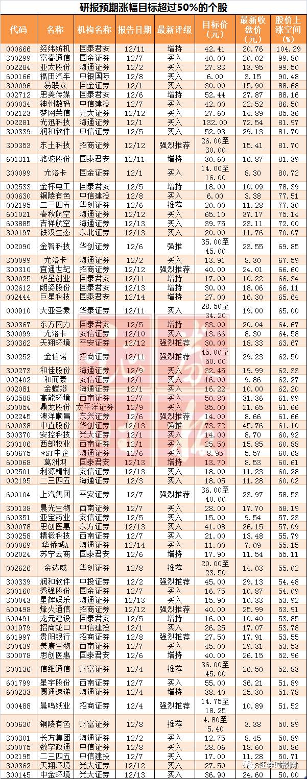 12月份以來,券商給予的目標位中,有70只個股預期漲幅均在50%以上。按預期最高漲幅計算,經緯紡機(000666)(104.29%),富春通信(300299)(99.80%),亞太股份(002284)(99.50%)排名前三位。