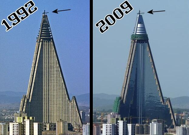 柳京飯店取自平壤古稱“柳京”,始建于1987年,為朝鮮最高建筑,曾連續爛尾近二十年,直到2008年朝鮮政府重啟建設,圖為1992年和2009年的柳京飯店對比圖。