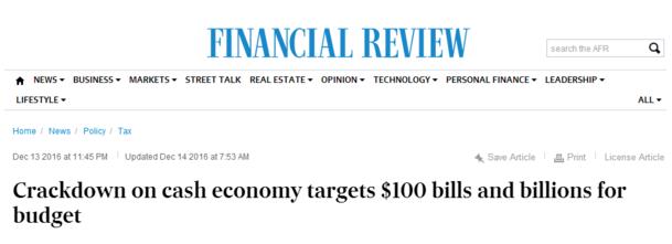 據澳大利亞金融評論報道,當地時間本周三(12月14日),澳大利亞稅收及金融服務部部長奧德懷爾(Kelly O'Dwyer表示),為了追回數十億的稅款,澳大利亞政府將對100澳元紙幣和超過一定額度的現金支付進行審查。