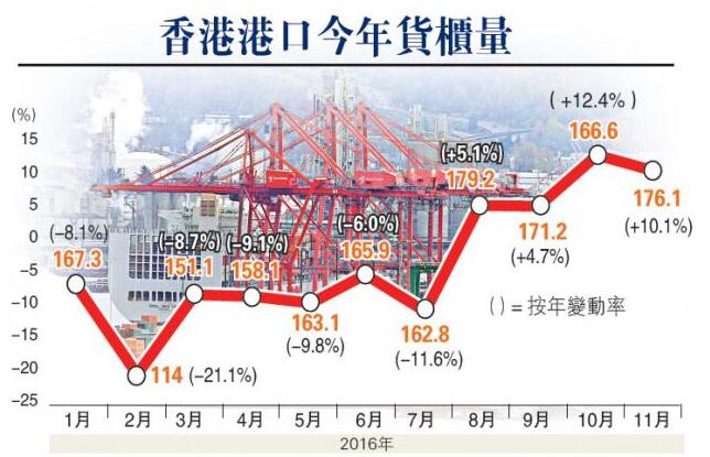 全球其他港口方面,排名第二的新加坡港上月貨櫃量升7.02%至257.31萬箱,首11個月貨櫃量跌0.95%至2813.42萬箱。至於去年全球排名在香港之後的韓國釜山港,則僅公布了上半年貨櫃量為962.2萬箱,半年數據趕超香港的919.5萬箱。不過,市場分析認為,韓國韓進海運在8月底申請破產保護,將大大影響韓國釜山港的吞吐量情況。
