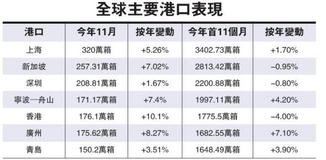 11月中國進出口雙雙上升,帶動內地一眾港口吞吐量上升。根據中國港口協會集裝箱分會數據顯示,全球排名第一的上海港上月貨櫃量升5.26%至320萬箱,首11個月升1.7%至3402.73萬箱。深圳港上月亦升1.67%至208.81萬箱,首11個月則跌0.8%至2200.88萬箱。與香港在同一區域的廣州港,表現標青,上月貨櫃量升8.27%至175.62萬箱,首11個月升7.1%至1682.55萬箱。