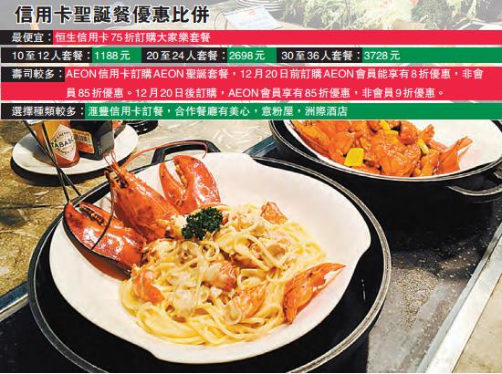 不少朋友都會選擇在家裏開聖誕party,外賣叫聖誕餐,最便宜就是用恒生信用卡叫大家樂的外賣。從即日起至12月20日,用恒生信用卡訂購大家樂聖誕派對套餐可以享有75折優惠,而用其他信用卡只可以享受8折優惠。當中,10至12人套餐為1188元。