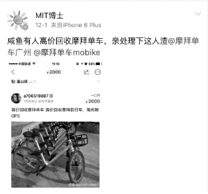 近日,有網友在微博爆料稱,摩拜等共享單車的出售信息出現在一些二手車平台上,一輛摩拜的價格在2000元左右。在某二手交易平台上,還有人出價2000元回收摩拜單車。記者在網友發的截圖上看到,“2000元高價回收摩拜自行車”,條件是“需拆除GPS”。