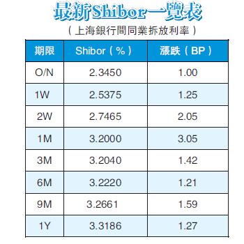 隔夜Shibor漲1個基點報2.3450%;7天期漲1.25個基點報2.5375%。14天期上漲2.05個基點到2.7465%。