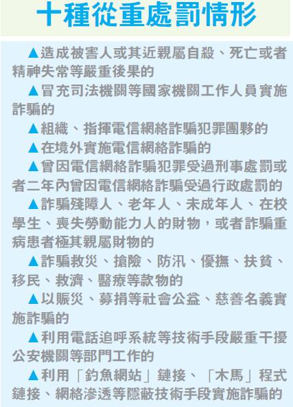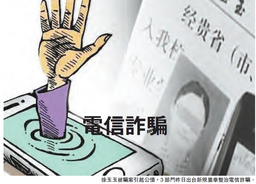 【香港商報网訊】今年以來,山東臨沂徐玉玉被電信詐騙致死等幾起在校學生被騙走學費而導致猝死或自殺的案件,激起全國網友對電信網絡詐騙行為的強烈聲討。針對電信網絡詐騙這一「過街老鼠」,最高法、最高檢、公安部3部門昨日出臺新規重拳整治,其中明確規定,詐騙老年人、在校學生等將從重處罰;詐騙財物價值3000元以上可判刑,超50萬元最高判無期;發布的詐騙資訊網頁瀏覽量超5000次,可判3-10年;為詐騙分子制作、提供「劇本」,將以詐騙共同犯罪論處。