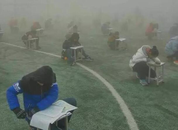 投訴人閆先生給記者發來兩張照片,照片顯示,天氣灰蒙蒙的,在一個露天的足球場上,很多學生半蹲著趴在凳子上做卷子,由于霧霾太大,第2排后面的學生身影已經很模糊。20日下午3時50分左右,大河報記者趕到林州,當地的空氣霧霾十分嚴重,能見度只有二三百米。在臨淇鎮一中學校附近,記者見到了閆先生。他告訴記者,現在學校已經知道記者要來采訪了,臨時放假了,考試也取消了。隨后,在校門口,該校八年級的一名學生告訴記者,學校確實確實在12月19日考試了,上午考英語和數學,下午考語文和物理。該學生告訴記者,八年級共十個班,每個班六七十人,大家都參加了考試,“在操場上考的,搬著凳子在外面”。