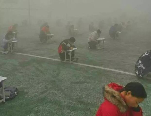 連日來,河南安陽地區空氣嚴重污染,空氣污染指數連續爆表,林州市教體局下發了全市中各中小學、幼兒園停課通知。然而,昨日上午,大河報記者接到林州市臨淇鎮一中學生家長的投訴電話稱,在這種霧霾天氣,該校不僅沒有給孩子放假,還組織幾百名學生在操場上進行考試。
