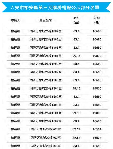 數天前,六安市裕安區政府網站發布了一條第三批審核合格的464戶購房補貼公示稱,此次購房補貼總面積:45622.78平方米,補貼總金額9124556元。引發熱議的是,公示顯示身份證號碼3401開頭的一名合肥購房者一共購買了44套房子,全部位於同一小區,位於六安市裕安區城南鎮,售樓網站顯示該樓盤在售均價為4000元。上述44套房產面積80多至100多平米不等,按照當地此前出台的政策,每套房子補貼面積近2萬元,該名合肥購房者共獲得補貼約80萬元。