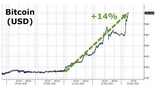 比特幣連續第三天暴漲,中國市場開盤后,比特幣價格沖破900美元關口,最高漲幅接近6%,這是2013年12月以來首次。