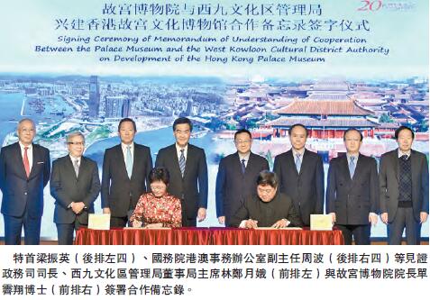 【香港商報網訊】駐京記者張麗娟報道:西九文化區管理局將與故宮博物院合作,在西九文化區興建香港故宮文化博物館,長期展出故宮博物院的文物珍藏。昨日下午,政務司司長兼西九管理局董事局主席林鄭月娥,與故宮博物院院長單霽翔在北京簽訂合作協議,正式啟動項目。簽字儀式由行政長官梁振英與國家文化部部長雒樹剛見證。香港故宮文化博物館預計2022年竣工。