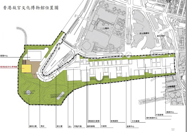 香港故宮文化博物館將於西九文化區西面臨海地段興建,北面毗鄰擬興建的展覽中心。博物館占地約10000平方米,總建築樓面面積約30500平方米。主要設施包括多個展覽廳、教育活動室、演講廳、紀念品店等。部分展廳會長期展出有關故宮文化歷史以及與宮廷生活有關的文物,其他展廳會陳列故宮的書畫、陶瓷、器物和其他藝術收藏,亦會有專門展出香港收藏家藏品的展廳,及另外兩個專題展廳。